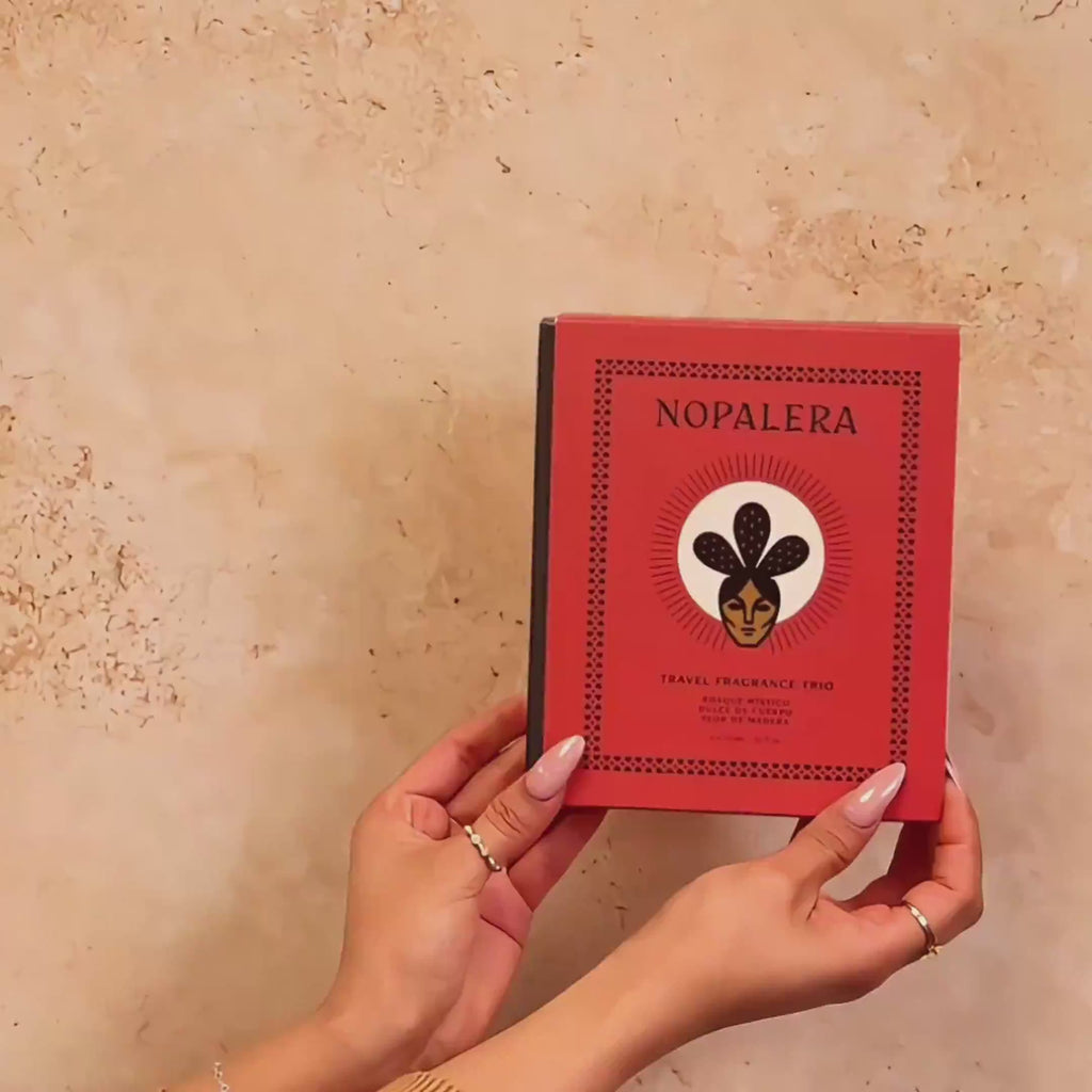 Nopalera travel fragrance trio with a red box on a peach background